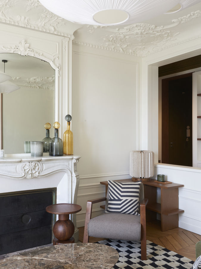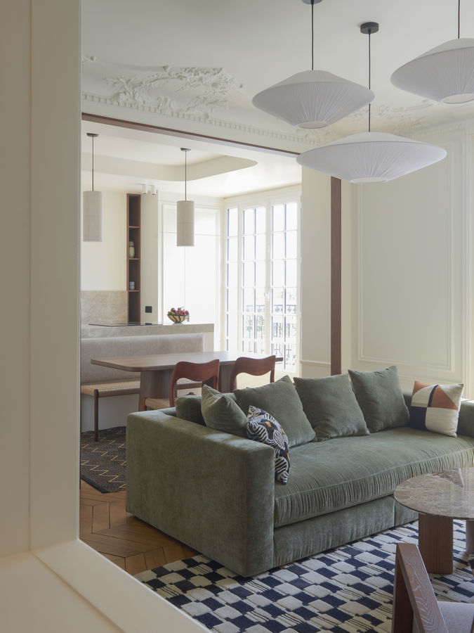 Cette nouvelle distribution a permis de mettre les pièces de vie au centre de l’appartement et de privilégier la lumière naturelle pour ses pièces car elles donnent sur deux balcons et sur une vue complètement dégagée sur les toits de Paris.
