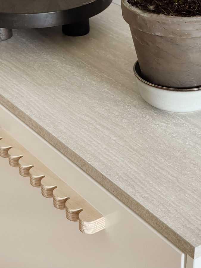 Dans le projet Saint Antoine, les détails, la répétition et la courbe tissent un lien étroit entre les espaces et créent une architecture ludique à partir d'un base économique de mobilier du commerce. Les poignées sur mesure de contreplaqué chêne, découpées à la fraiseuse numérique se déclinent sur du mobilier grand public disposé astucieusement et lié par des plateaux de CP chêne.
