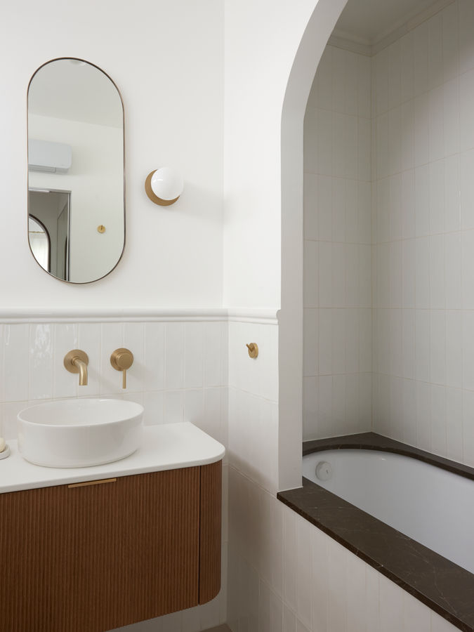 La courbe et les arrondis sont donc au centre de ce projet. Des arches viennent cadrer les espaces à mettre en valeur et créent de véritables points de vue. La courbe elle permet dans cet appartement de ramener de la fluidité et de la douceur.
