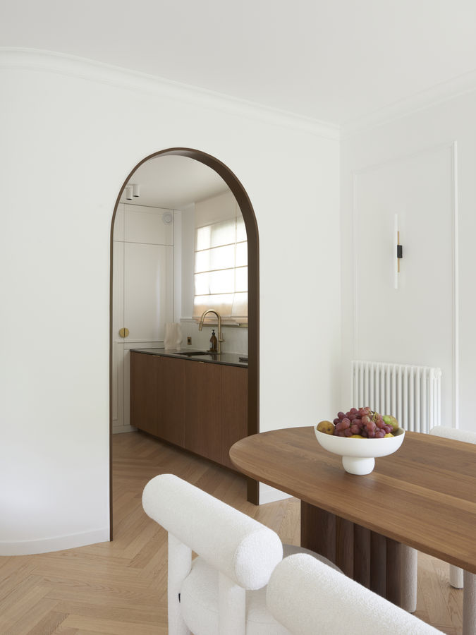 La cuisine est dans la même lignée que le séjour, elle a été pensée comme une cuisine pratique et fonctionnelle pour une famille mais avec des codes esthétiques revisités. Le bois strié et le marbre mêlés aux placards moulurées invisibles participent à la connexion de la cuisine au séjour. L’arche donnant sur la salle à manger vient sublimer d’un côté la cuisine et de l’autre la salle à manger.